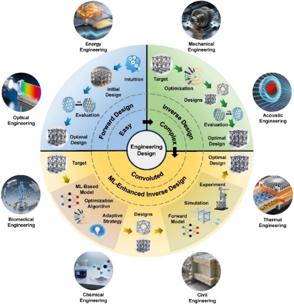 作为现代工程技术的核心基石,功能材料的性能直接决定尖端技术的发展上限,从芯片中的光子晶体到航空航天的高强度合金,机器学习驱动其设计模式的革新,将深刻影响多个行业的发展格局。论文提出了一种机器学习驱动功能材料逆向设计的统一研究视角,将分散于各学科领域的研究成果整合为标准化、系统化的方法论框架,为下一代功能材料的创新研发提供了权威且可落地的指引,打破了传统材料设计的固有瓶颈,为多领域技术创新开辟新路径。特别的,该文章还全面地总结了当前基于机器学习的超材料逆向设计在实际工程中的应用,包括机械工程、能源工程、光学工程、热学工程、声学工程、生物医学工程、化学工程等,为读者提供全面的视角。